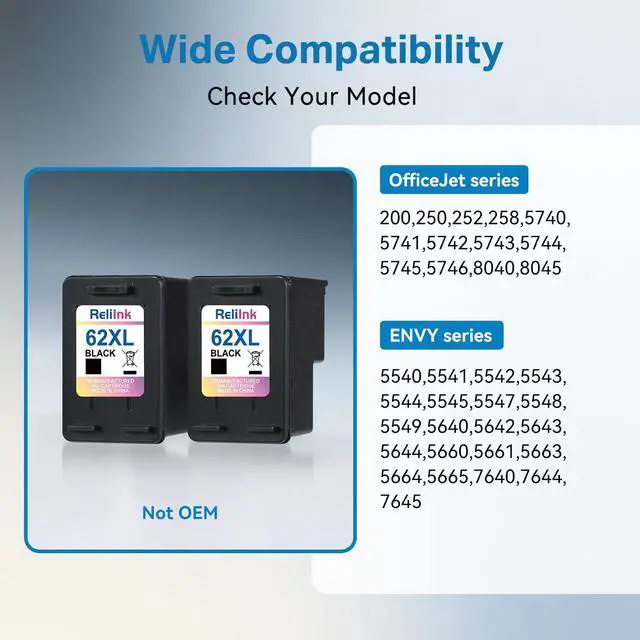 ^^ Wide Printer Compatibility: ReliInk 62xl black ink cartridges for hp printers are compatible with various printers, including HP Envy 5540 5541 5542 5543 5544 5545 5547 5548 5549 5640 5642 5643 5644 5660 5661 5663 5664 5665 7640 7644 7645 OfficeJet 200 250 252 258 5740 5741 5742 5743 5744 5745 5746 8040 8045. Whether youre printing at home, in a small business, or for school project, these 62xl ink cartridges black deliver consistent quality and smooth operation.
