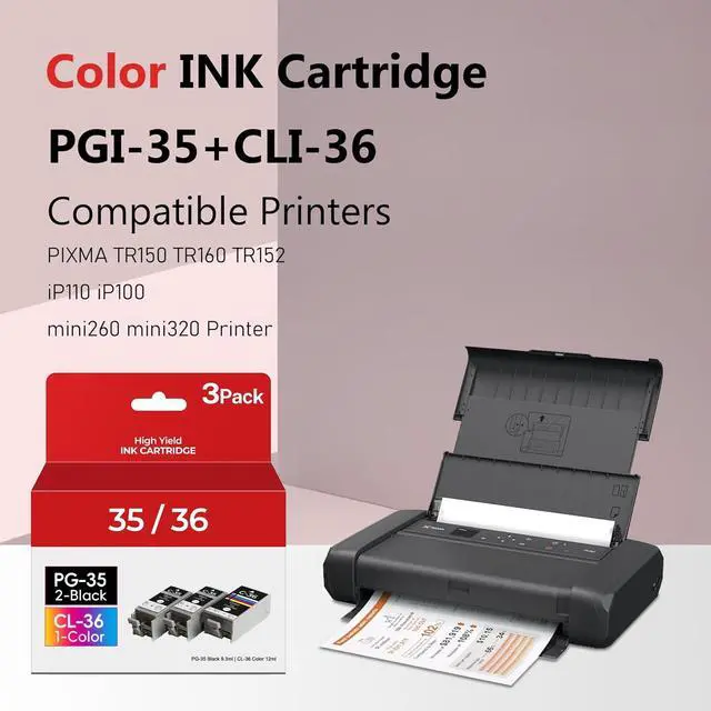 Package Content: 35 36 ink cartridge, include 2 pgi 35 ink cartridges, 1 cli 36 ink cartridge ^^ PGI-35 CLI-36 Ink Cartridges Printers Compatibility: PGI35 CLI36 ink cartridges black color combo pack compatible with PIXMA TR150 iP110 iP100 TR160 TR152 mini260 mini320 ip 110 100 TR 150 152 160 mini 260 320 Printers ^^