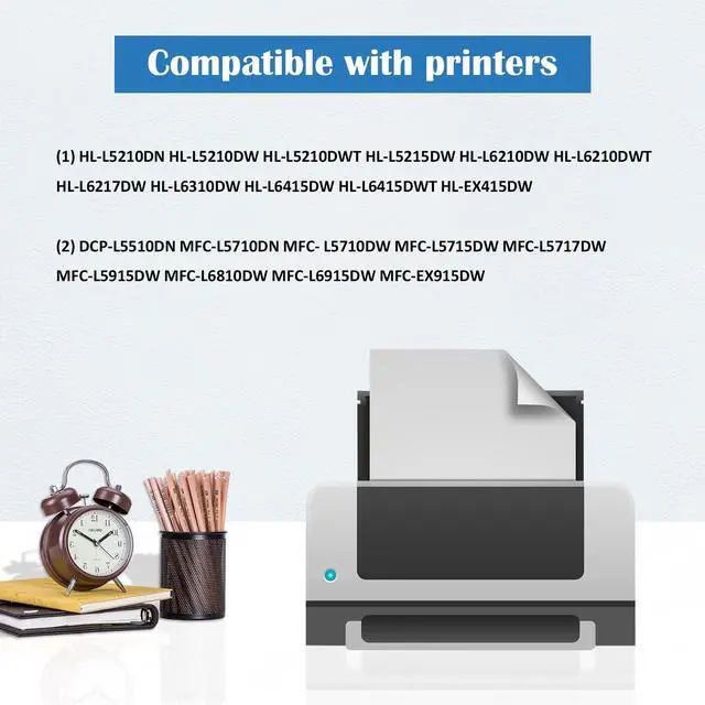 Attention - - 1. If the printer prompts Non Brother Toner, please click Yes to continue. 2. If the printer prompts "445, 446" or "Cartridge Error", please restart the printer. ^^ Compatible Printers - - Compatible for Brother HL-L5210DN HL-L5210DW HL-L5210DWT HL-L5215DW HL-L6210DW HL-L6210DWT HL-L6217DW HL-L6310DW HL-L6415DW HL-L6415DWT HL-EX415DW; DCP-L5510DN MFC-L5710DN MFC- L5710DW MFC-L5715DW MFC-L5717DW MFC-L5915DW MFC-L6810DW MFC-L6915DW MFC-EX915DW Printers. ^^ Package Contents - - Include 1 pack black compatible TN920XXL toner cartridges. High Capacity, up to 11, 000 pages per cartridge (Based on ISO / IEC 19752).