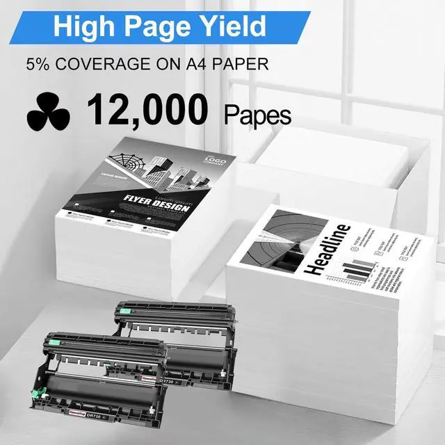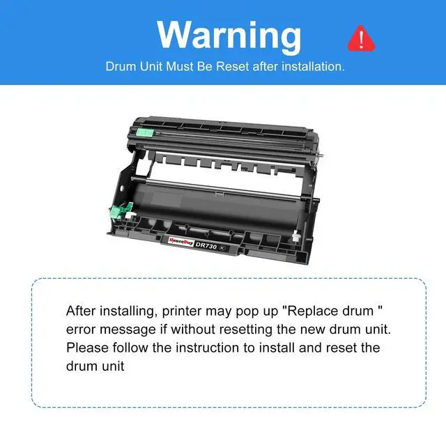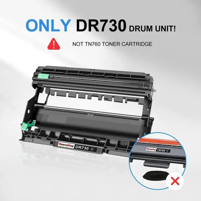 Package Contents2 Pack of Compatible 760 drum unit replacements for DR730 DR-730. NOT Include TN760 Toner Cartridges. (DRUM unit only, not included toner cartridge) ^^ Compatible PrintersCompatible with HL-L2325DW HL-L2350DW HL-L2370DW HL-L2390DW HL-L2395DW HL-L2370DWXL DCP-L2550DW MFC-L2710DW MFC-L2717DW MFC-L2750DW MFC-L2730DW MFC-L2750DWXL MFC-L2690DW Laser Printer ^^ Page Yeild12000 pages per 730 drum unit (at 5% coverage of A4 paper) ^^ Warm TipsIf your printer displayDrum Ends Soon, "Replace Drum" or Drum Endedmessages during installation. Please follow the "IMPORTANT NOTE" on the product to scan and view the instructions to install and reset the drum unit ^^ Upgraded Version HenceBuy Compatible DR-730, Perfect partner with your printer, Easy to be installed and recognized.