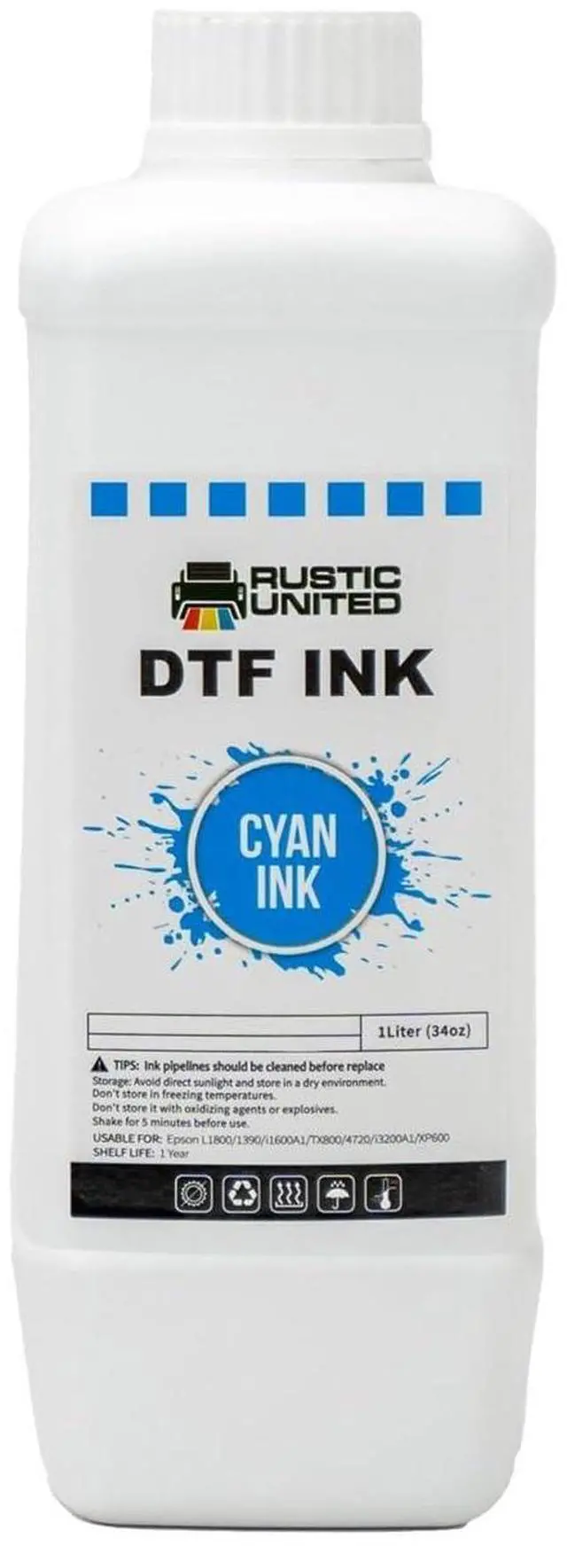 RUSTIC UNITED Premium DTF Ink, 1LT/ 34oz Heat Transfer Printing Direct to Film Refill for All DTF Printers Epson ET-8550, L1800, L800, R2400, P400, P800, XP15000, R1390, I3200 (Cyan)