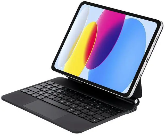 This Magic Keyboard uses strong magnets to securely attach your iPad and lets you easily adjust the floating stand to the perfect angle for typing or browsing. It turns your iPad into a fully functional laptop in seconds! The slim, lightweight design fits perfectly with iPad 11& iPad 10th, ideal for work, study, or travel. ^^ Trackpad with