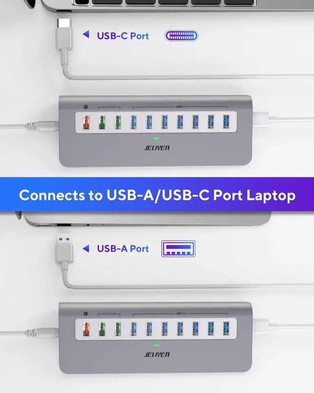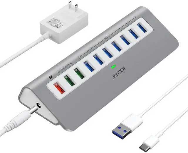 Powered USB Hub: Expand your connectivity effortlessly with the JELIYEA 10-in-1 USB hub, designed as a powered USB hub for professional workstations. Equipped with 7 ultra-fast 10Gbps USB 3.1 ports and 3 dedicated fast charging ports, this multiport USB adapter lets you connect hard drives, flash disks, keyboards, printers, cameras, and moreall at once and without lag. Experience reliable performance and streamlined efficiency with this 10Gbps USB hub ^^ SuperSpeed 10Gbps
