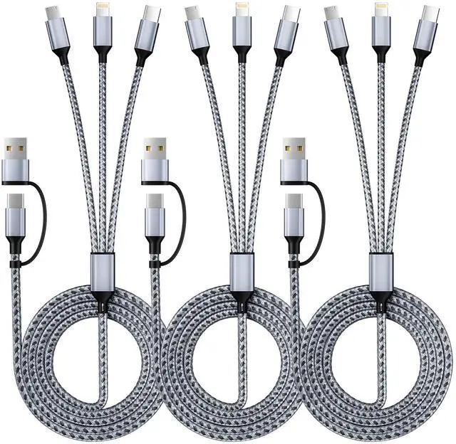 3 in 2 Multi Charging Cable(3Pack 4FT), USB A+USB C Charging Cable Nylon Multi USB Cable Universal Charging Cord with Type-C, Micro USB and IP Port for Cell Phones and More