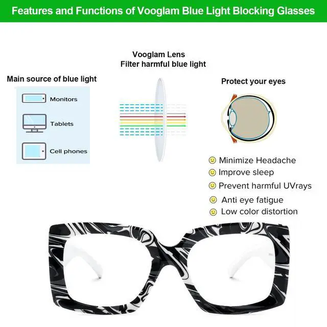 Range: 2.13 "" ~ 3.07"" /(54~78 mm)Product instruction: (1) Why do we need to filter blue light? Blue light from our computers, phones, tablets, and other electronic products causes our eyes to not only work harder but puts them at risk of aging faster. By wearing blue light blocking glasses, you can limit the amount of blue light that enters your eyes and make your screen time more pleasant. Reduce eye strain, eye fatigue, and sensitivity to light during computer terms or any other digital time. Protect Your Eyes from macular degeneration and early vision loss, more concentrate on working and learning. Vooglam glasses are specially designed to filter out harmful blue light. Reduce the symptoms of digital eyestrainEyestrain, Headaches, sore or tired eyes, and stiff necks are all symptoms of digital eyestrain. Voogueme blue light blocking glasses make screen time more comfortable and help eliminate symptoms of digital eyestrain.