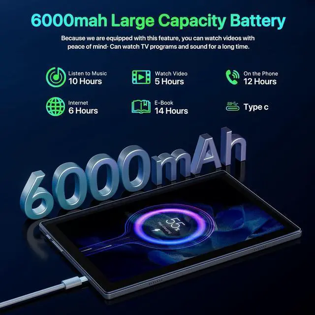 Experience smooth, lag-free performance for everyday tasks, browsing, and multitasking, powered by an advanced octa-core processor and a massive 12GB of RAM that's more RAM than many budget tablets, including some Fire HD models. Coupled with the latest Android 14 and full Google Play Store access, it offers a complete and up-to-date ecosystem for all your apps and games. ^^ Enjoy all-day battery life (8-12 hours) for streaming, classes, or work with the high-capacity 6000mAh battery. Stay reliably connected with stable dual-band WiFi ( 2.4G /5G) and WiFi 6, ensuring fast downloads and buffer-free video callsa feature customers specifically praise for its reliability.