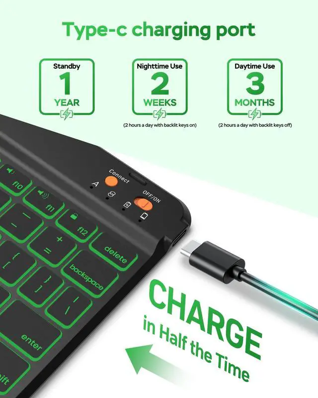 Illuminate Your Typing: Enhance your iPad with a 7-color backlit keyboard and laser-etched keys. Perfect for any lighting, from late-night work to cozy cafes. Enjoy quiet, comfortable typing with customizable backlighting and ergonomic scissor-switch keys ^^ All-Day Power for