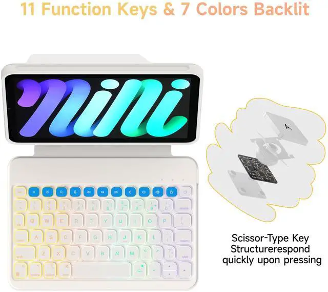^^ Precise Cutouts & Full ProtectionThe protective cover is precisely cut to match the openings of the iPad mini 6, fitting snugly around the edges to provide comprehensive protection. ^^ 11 Function Keys and 7-Color BacklightEquipped with 11 individual function keys, you can activate functions with just a click. 7-color LED backlight also provides a fresh typing experience. ^^ Auto-Lock to Prevent Accidental OperationsHOU keyboard case for ipad mini 6 automatically locks when it detects your flip action, preventing accidental operations due to pressure.