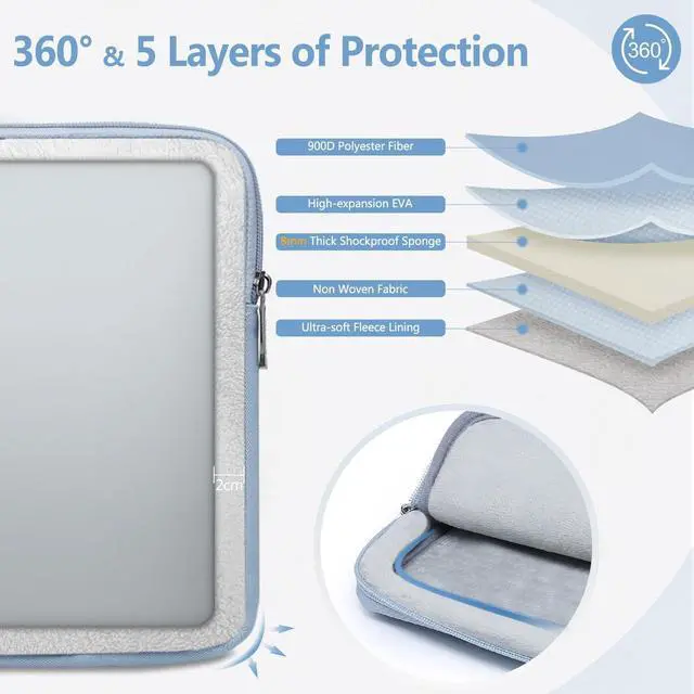 • 360 Multi-layer Superior Protection: The outer fabric is made of 900D polyester fabric, which is water-resistant, scratch-resistant and wear-resistant. The middle layer is padded with 8mm thickness to absorb bumps and shocks. The soft velvet lining protects your laptop from scratches when you take your laptop out/in. There is also a 2cm wide protective ridge all around. As a result, your laptop is always tightly wrapped and protected with 360 multiple protection