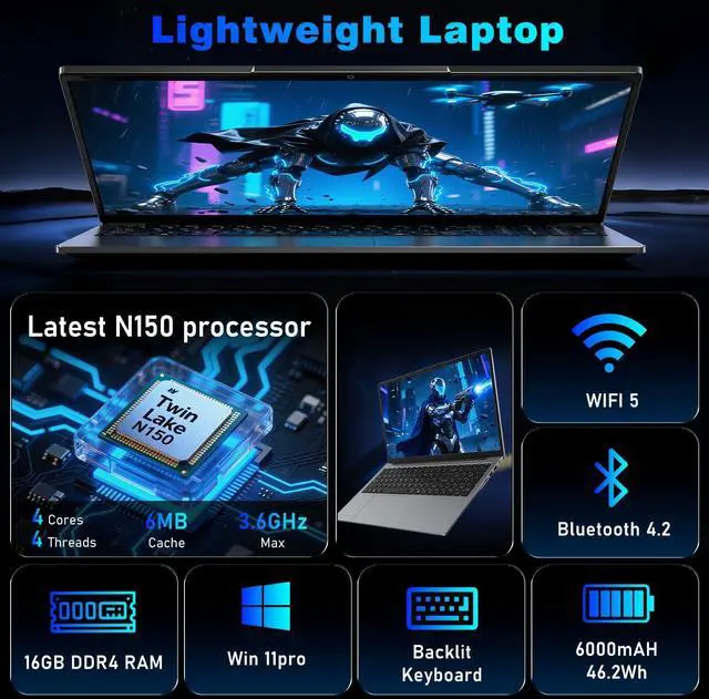 Powerful performance for diverse tasks: This laptop is equipped with an N150 processor ( 0.8GH z- 3.6GH z), enabling smooth handling of office tasks such as running multiple software programs simultaneously and performing complex Excel operations. It also effortlessly handles light gaming modes, providing an ultimate comfortable experience.