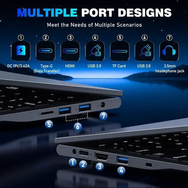 ^^ User-friendly design details: This laptop features a backlit keyboard for comfortable typing in low-light conditions. It comes equipped with Office 365 to handle your daily office tasks. Its slim profile fits easily into a backpack, while the durable metal chassis withstands everyday bumps and pressure. Additionally, built-in stereo speakers and a microphone cater to multimedia entertainment and communication needs.