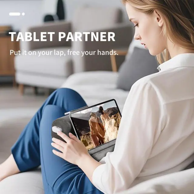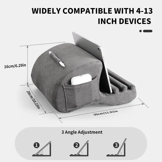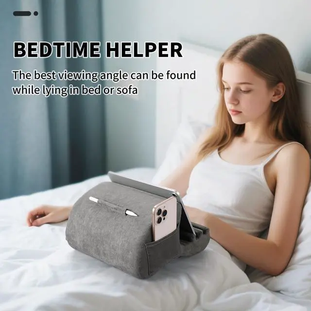 ^^ DEEPENED GROOVES: The tablet pillow stand has widened and deepened fixing grooves, which can well fix your device so that it won't slip. The base of the tablet stand is made of high-quality high elastic sponge, not easy to deform. The surface is very soft plush polyester, which can be removed and washed to keep the tablet pillow holder pillowcase clean ^^