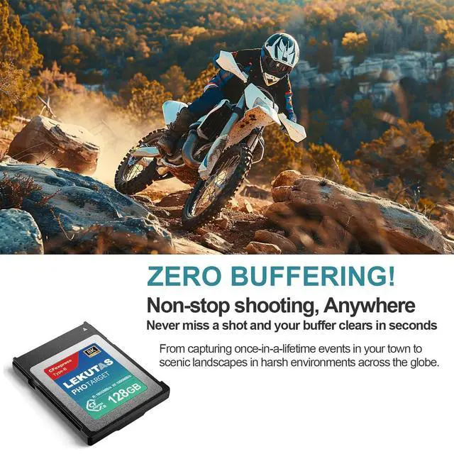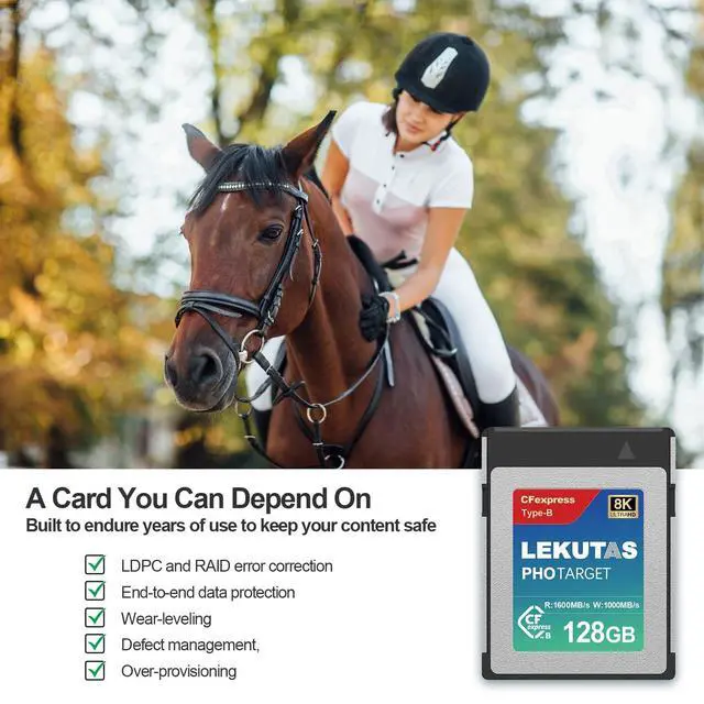 NON-STOP SHOOTING - LEKUTAS CFexpress Type B Cards are specifically crafted for the rigorous demands of professional use, whether you're capturing precious moments or stunning landscapes worldwide. Perfect for flawlessly capturing full-frame burst shooting so you never miss a shot and your buffer clears in mere seconds. ^^ TRANSFERS IN SECONDS - Easily capture 4K, 8K, and beyond with our read speeds of up to 1600MB/s and 1000MB/s write speeds. Spend less time transfering means more time creating. ^^ A CARD TO DEPEND ON - By incorporating a range of advanced flash management techniques such as LDPC and RAID error correction, end-to-end data protection, wear-leveling, defect management, and over-provisioning, LEKUTAS CFexpress cards are designed to withstand the test of time and safeguard your valuable content for years to come.