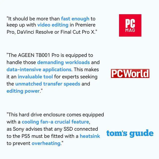 MB/s Transfer Speeds: Blazing-Fast for 4K/8K Editing & Large Files - Achieve up to 6000MB/s read/write with PCIe 4.0 x4 NVMe SSDs (avoid PCIe 5.0 ). Transfers 1TB in 5 minutes - ideal for professionals using this M. 2 SSD enclosure.