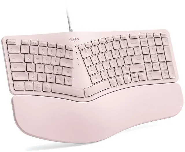 Ergonomic Split DesignEmbrace a more natural typing posture with Nulea ergonomic keyboards unique split design. It adapts to the natural alignment of your hands, ensuring comfort and reducing strain during long typing sessions ^^ Luxurious Wrist SupportExperience the pinnacle of comfort with our keyboards oversized wrist rest, crafted with a soft, skin-friendly leatherette design. It provides ample support to your wrists, helping prevent fatigue and strain ^^ Adjustable Tilt for Optimal ComfortCustomize your typing angle with ease! This keyboard features adjustable support tilts, offering three different angles to suit your personal preference and ensure ergonomic alignment ^^ Stable Wired ConnectionExperience the reliability of a stable wired connection, enhanced by a durable braided nylon cable that resists wear and tear.