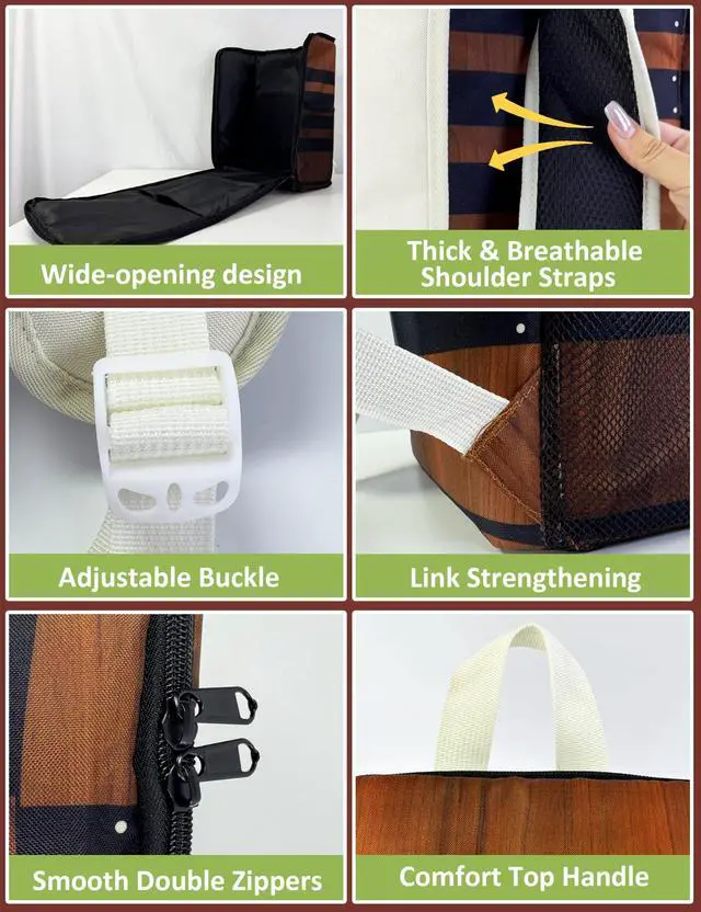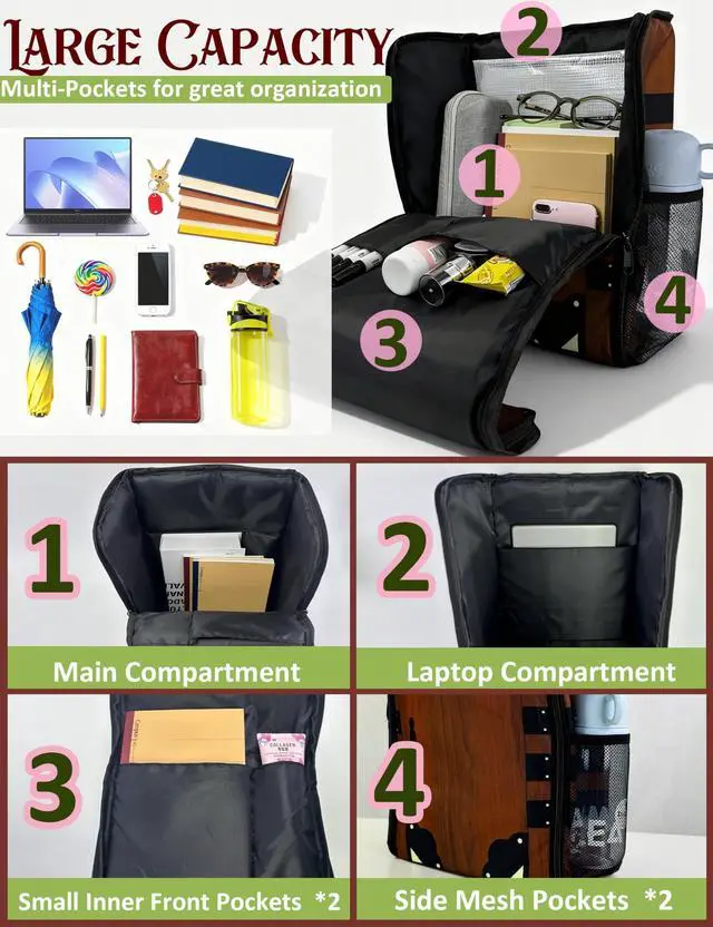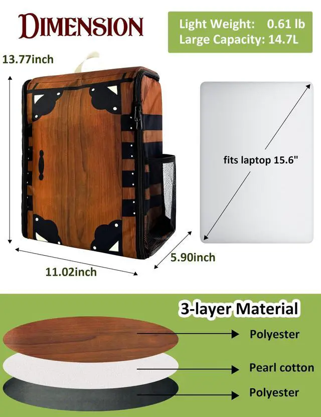 Ideal Dimension & Large Capacity 11.02L 5.90W 13.77H (281535 cm), with 14.7L capacity, weight is 0.61 lb, suitable size for adults. Great backpack size as school backpack, casual backpack, work backpack, travel backpack or laptop backpack. ^^ Multi-Pockets Organization4 pockets. 1 large main compartment. 1 inner laptop compartment (fits 15.6" laptop). 2 small inner front pockets to store small items. 2 side mesh pockets for storing water bottle, umbrella. Most of school work daily necessities can be loaded. ^^ Wear-Resistant & Three-layer MaterialSurface use digital printing, bright colors and wood pattern is realistic.