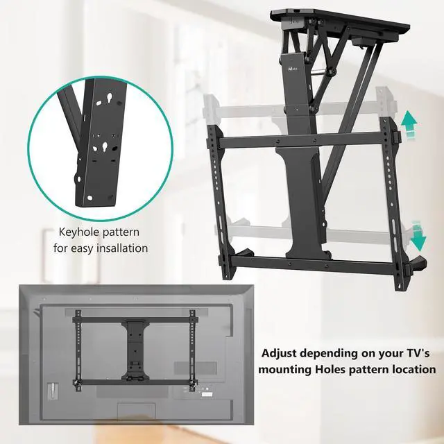 Sturdy & Space Saving: Electric Ceiling TV Mount, when you don't use it, you can remote to fold it up to save space, creating a clean and uncluttered look in your living area. There is no risk of the TV hitting the ceiling or having an awkward overhang, providing a sleek look once installed. This tv mount is ideal for ceilings, pitched roof, bedrooms, offices, kitchens, and workspaces. ^^ Remote &