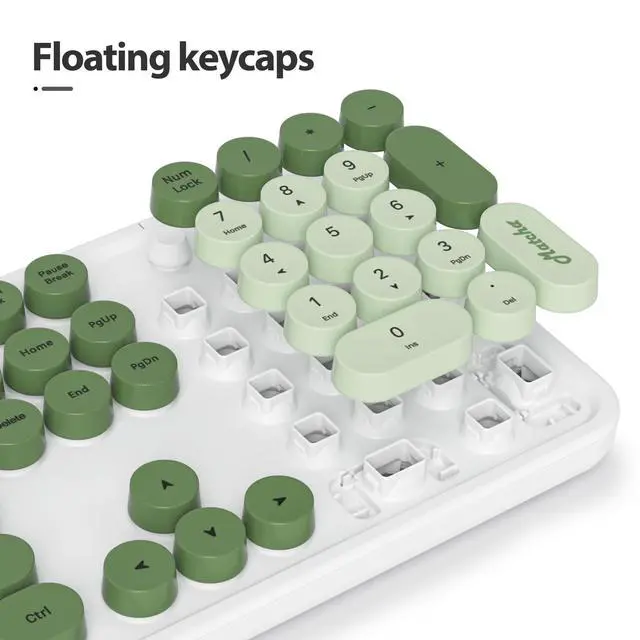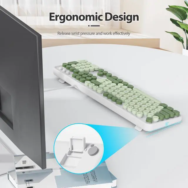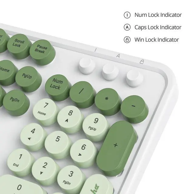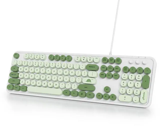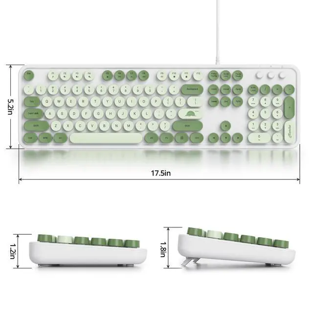 Cute Matcha Wired typewriter KeyboardThe most cute matcha theme keyboard with green color, attracts more people's attention, gives you a different vision, enjoys a different keyboard experience, creates a colorful desk, and brings you a happy mood! ^^ Detachable Keycaps & Floating Button DesignAll buttons can be disassembled, put in water to clean, and also equipped with a brush to clean the garbage on the keyboard. The floating button design gives you a soft and quiet feeling, and takes you back to the most original type of Typewriter Style! ^^ LED IndicatorThe wired keyboard has Keypad Lock Indicator, Caps Lock Indicator, Power Indicator, which can improve your work efficiency.