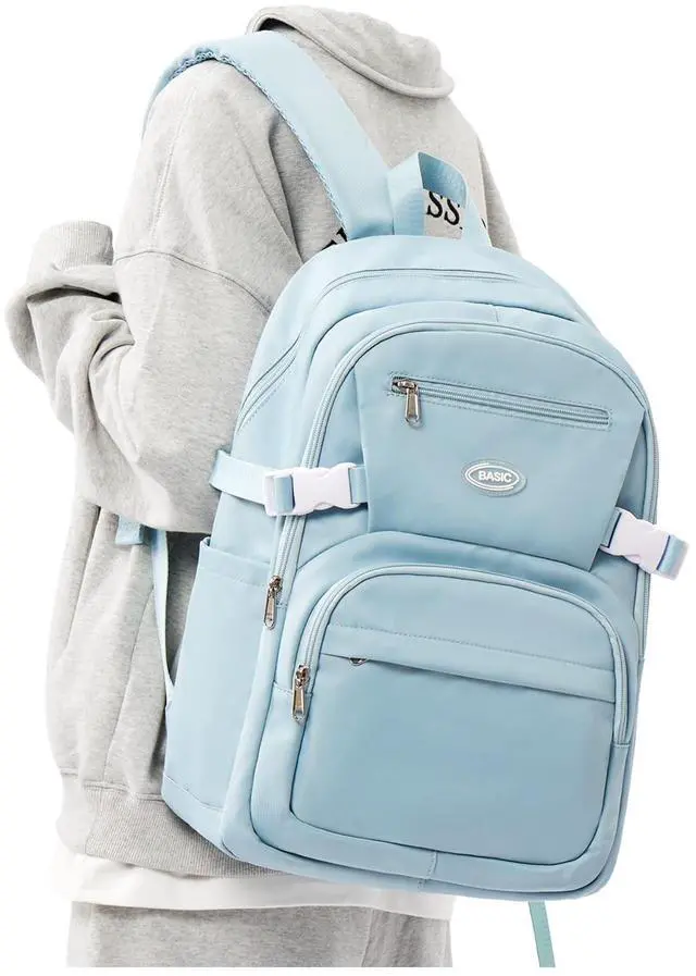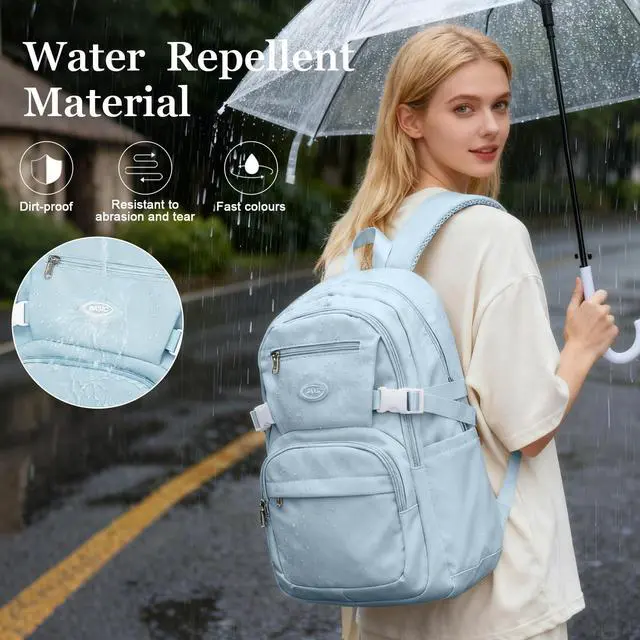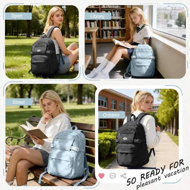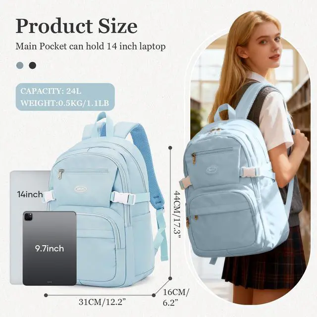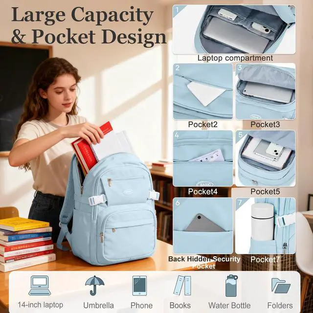 [Large Capacity] This bookbag has a spacious main pocket with large compartments for clothes, folders, cameras, mugs, umbrellas, and everyday items. The main compartment can accommodate a 15.6 -inch laptop, and there are four front zippered pockets to store different things respectively. The back of the backpack has an anti-theft pocket to store valuables. ^^ Lightweight materialThis bag is made of waterproof and durable polyester fiber, waterproof (can not be continuously exposed to rain), breathable, good heat dissipation, two padded shoulder straps, light to carry, strong reinforcement, reduce shoulder pressure, keep cool when carrying for a long time.
