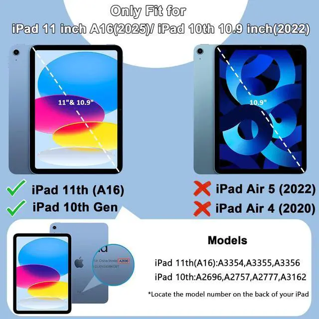 Model Specification Designed for iPad (A16) 11th generation 11 inch/ 10th generation 10.9 inch (Model includes: A3354/A3355/A3356/A2696/A2757/A2777/A3162) 2025/2022 released. Please check back bottom of your iPad to find the model number.