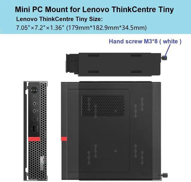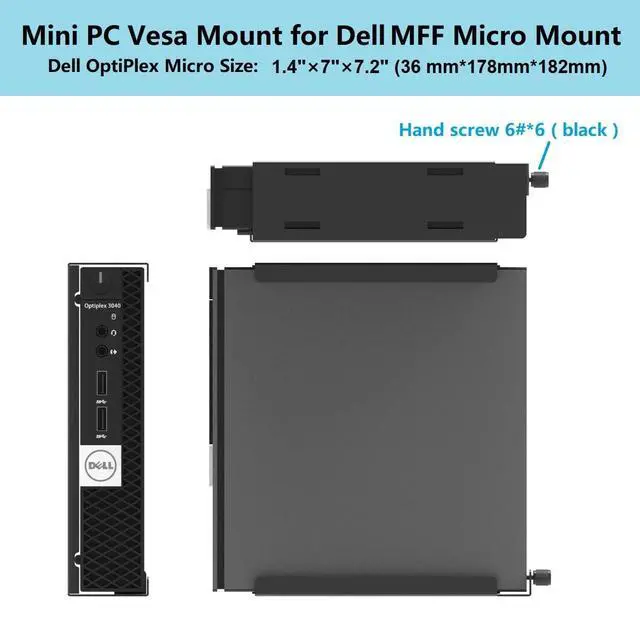 This mount is compatible with Dell OptiPlex Micro Form Factor Case and Lenovo ThinkCentre Tiny Desktops. The compatible models are as follows: Fits Dell Micro OptiPlex MFF 3000, 3020 MFF, 3040 MFF, 3046 MFF, 3050 MFF, 3060 MFF, 3070 MFF, 3080 MFF, 3090 MFF, 5000 MFF, 5050 MFF, 5060 MFF, 5070 MFF, 5090 MFF, 7000 MFF, 7040 MFF, 7050 MFF, 7060 MFF, 7070 MFF, 7080 MFF, 7090 MFF and more. Fits all Dell OptiPlex micro computers size 1.4" x 7" x 7.2". Doesn't fit OptiPlex tower or small form factor. Fits Lenovo ThinkCentre Tiny Desktops M900z M900x M900 M600 M700 M700z M715q M800z (Other models not listed are not available). Fits Lenovo ThinkCentre Tiny Lenovo ThinkCentre Tiny Size: 7.05" x 7.2" x 1.36".