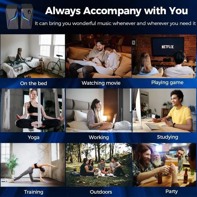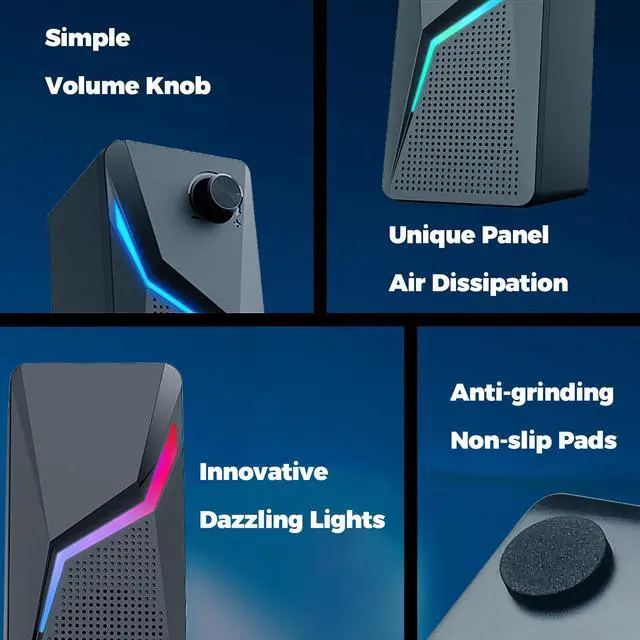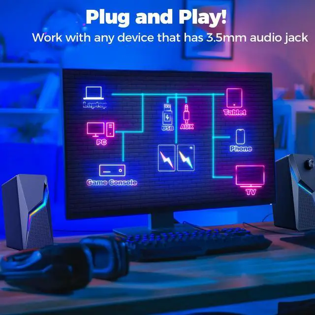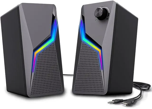 Super Sound Quality - Unique subwoofer technology and the latest material are adopted and excellent in high-performance precision drive and 360 surround sound design. The sound quality is high and it is a gem that excels in the low range. 2.0 Channel stereo speakers, enjoy the best stereo effect! ^^ Easy Operation & Full Compatibilities - Just plug and play. The usb cable for power and the aux in cable for the sound. Work with any device that has a standard 3.5 mm headphone jack, such as desktops, laptops, cellphones, tablets, Gaming Desktop.