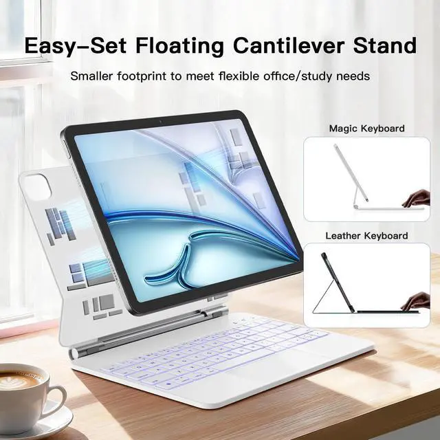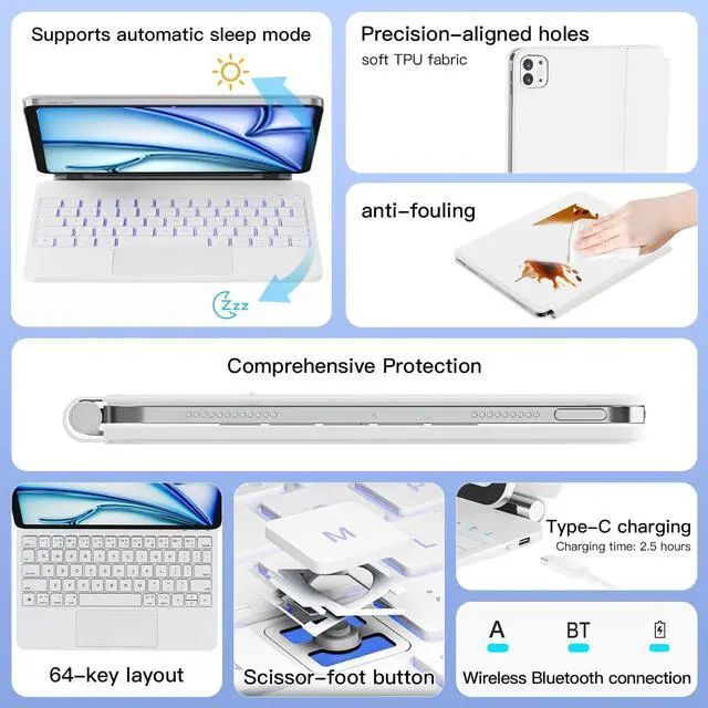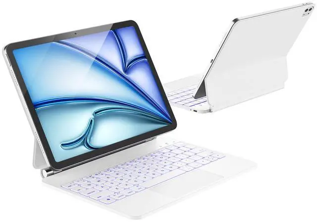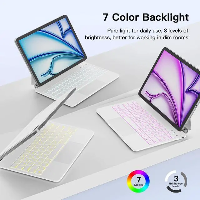 Note: Not compatible with 2024 iPad Pro 11-inch (M4). ^^ Precision Multi-Touch TrackpadFeatures an integrated precision trackpad that can quickly and easily navigate the iPad. Full multi-touch gesture support allows you to edit documents, create presentations and browse the Internet at unparalleled speed. ^^ Easy-to-install magnetic bracket The suspended floating design allows your iPad Pro 11 and iPad Air 11 to float stylishly over your keyboard, giving you the perfect angle with just opening the case. Once connected, when you turn on the computer again it will connect. ^^ 7-color backlit keysiPad Magic features a 7-color backlit keyboard with 3 brightness settings to make sure you can easily type in low light. If the keyboard doesn't work for 10 minutes, it automatically enters sleep mode. Simply press any key and the keyboard instantly wakes up and connects to your iPad for increased productivity. ^^ Long-lasting batteryThe large capacity battery and ultra-efficient design allow you to work longer on a single charge. Up to 200 hours of operation without lighting and up to 8 hours with lighting.