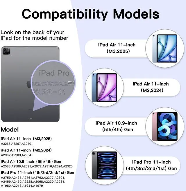 CompatibilityThe Magic Keyboard works with iPad Pro 11-inch (1st/2nd/3rd/4th Generation), iPad Air 11-inch(M3, 2025/M2, 2024), iPad Air 5th/4th Generation(2022/2020) 10.9 -inch.