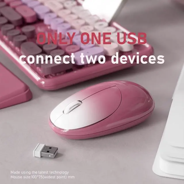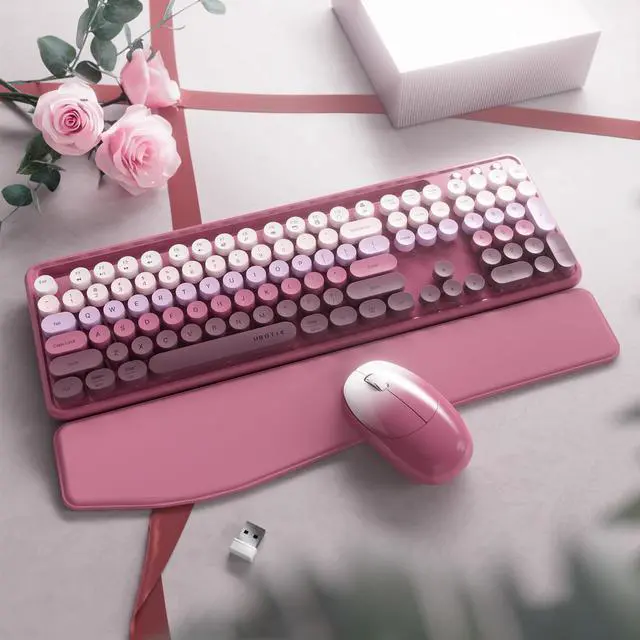 Stylish & Colorful Retro Design - Add charm to your workspace with a colorful wireless keyboard and mouse combo. Featuring 104 round floating keycaps in a vibrant, retro-style palette thats perfect for aesthetic desk setups ^^ Stable 2.4GH z Wireless Connection - Enjoy smooth, lag-free performance with 2.4GH z wireless technology. Just plug in the USB receiver for instant, reliable connectivityno drivers needed ^^ Built-In Phone Holder for Convenience - Multitask effortlessly with an integrated phone holder. Keep your device upright and within view while working, typing, or streaming ^^ Ergonomic Wrist Rest Support - Work comfortably for hours with the built-in wrist rest that reduces strain during long typing sessions.