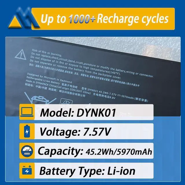 Battery type: Li-ion. (We only use grade A battery cells that provide up to 500 recharge cycles over the life of the battery. Come with screwdrivers. ) ^^ Compatible Part NumberDYNK01, G3HTA036H ^^ Replacement For Laptopfor Microsoft Surface 1st Gen 1769 2017 Series, Microsoft Surface Laptop 1782 13.5 '', Microsoft Surface Laptop 1769 13.5 '', Microsoft Surface 2-LQN-00004 KSR-00001 DAG-00003 ^^ SecurityAll Mobik products are certified by UL / CE / FCC / RoHS for safety. Were so confident in the performance of our replacement laptop batteries, strict guidelines for compatibility, strict quality control standards and standards compliance for environment safety. (including short circuit, overheat, and overload protections. )
