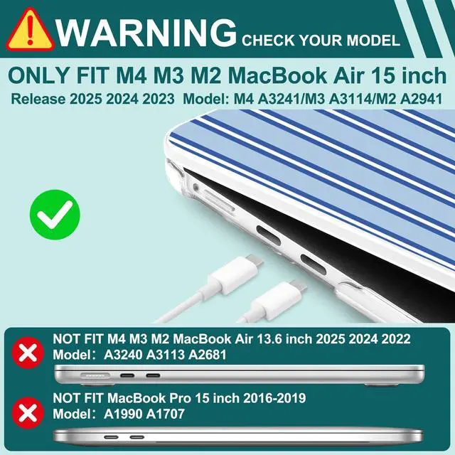 Compatible With - Only for M4/M3/M2 MacBook Air 15" 2025 2024 2023 (Only compatible model: A3241/A3114/A2941). Please confirm the model on the bottom of the MacBook before ordering ^^ Durable Material - MacBook Air 15-inch case is made of hard PC material, effective anti-slip/shockproof/anti-scratch etc ^^ Case Design - The case adopts the top and bottom case separation design, easy to install and remove ^^ Case Port Design - Precise cutouts allow full access to all ports, features, buttons, and Touch ID functionality ^^ Package - Included 1 MacBook Air 15 inch Case, 1 Keyboard Cover, 1 Trackpad Protector, 2 OTG Adapter