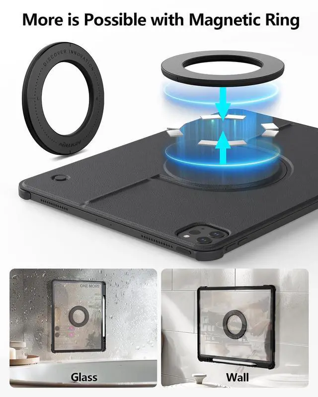 ^^ Upgraded Magnetic Wall MountNILLKIN upgraded 13 ipad air/pro keyboard case contains 2 types of magnetic attraction functions: 1. Backplate magnetic- which support adsorb on large area of metal surface, like refrigerator and whiteboard. 2. Extra magnetic ultra ring/wall mount - which support adsorb on any smooth plane (include metal surface), like wall or glass, more choice, more freedom. ^^ Detachable Backlit KeyboardWith simple buckle design, you can turn NILLKIN ipad pro m4 13 inch case from tablet to laptop in just one second. Features 7-color RGB backlighting and adjustable 3- brightness, our ipad pro 13 inch keyboard case with stand make you typing comfortable in any lighting condition, fearless in the dark, protect your eyes.