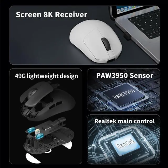 Latest Three Modes ConnectionDarmoshark wireless gaming mouse supports three connection modes to meet various user scenes. Switch to the 8Kmode and Bluetooth mode when playing games to save you the trouble of data cables and get longer battery life. If it is not enough, you can also switch to the traditional wired mode using the attached charging USB-C data cable. A maximum of 3 devices can be connected at the same time. Such games are very suitable for multi -device work ^^ PAW3395 SensorDarmoshark wireless gaming mouse adopts top 3395 sensor, up to 26000 DPI resolution, 650 IPS tracking speed, response speed can reach 1000-8000Hz, 50G acceleration, faster and more accurate than ordinary mouse, is committed to providing PC gamers the best Gaming experience ^^ Programmable Game MouseSupport 5 -programming keys, download software can set DPI, key function, player macro settings ^^ 49g Magnesium alloy materialPure right-handed ergonomic design, durable and light weight, perfect body design takes good care of various grip hand shapes and easily supports the palm of the hand.