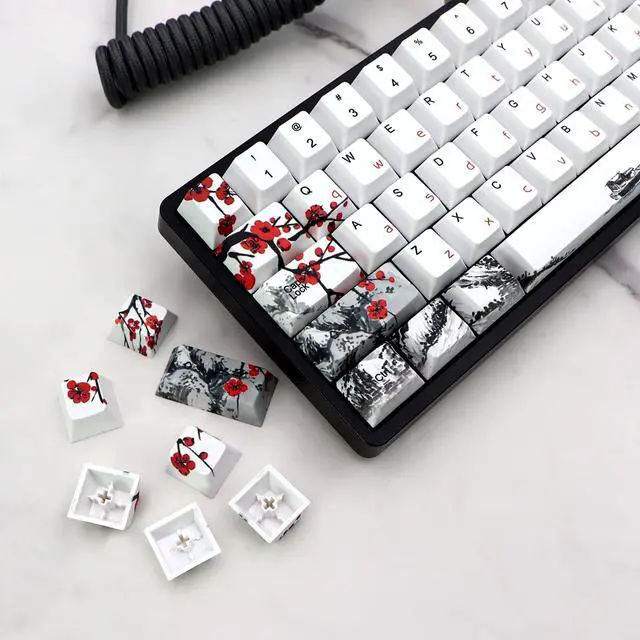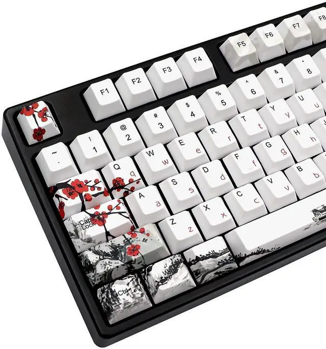 PBT Dye Sublimation KeycapsThe keycaps are made of high quality PBT dye sublimation process with matte texture and oil resistant coating, the advanced sublimation technology makes the pattern non-fading ^^ Cherry Profile KeycapsThe ergonomic ladder design and Cherry Profile of the keycaps and the curved layout ensure a comfortable use experience ^^ Compatibility135 keycaps included, compatible with Cherry MX switch keyboards 64/68/84/96/108, spacebar 6.25 u ^^ Artistic KeycapsThe keycaps feature a plum blossom pattern for a vivid and vibrant look and a more artistic feel, giving your keyboard a very beautiful and unique look ^^ NoteThis product is keycap only, no keyboard included; 1 keycap puller is included in the package, you can install your keyboard more easily