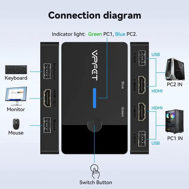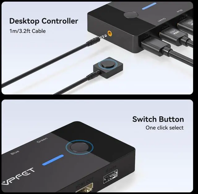 NOTE: If need to achieve 8K@60Hz resolution, in addition to the computers and monitors needing to support 8K, also need to use real 8K HDMI cable. ^^ KVM Switch with 2 USB 2.0 PortsThis USB KVM switcher with standard USB 2.0 port which can recognize wired/wireless keyboard mouse. It's fully compatible with USB 1.1 devices, and the KVM switch is also hot-swappable to connect devices without rebooting, ensuring flexibility and portability. ^^ 2 Switching Mode & Plug and PlayThe KVM switch saves desktop space by allowing you to freely switch between 2 computers via the buttons on the panel or the desktop controller (included in the package). The LED indicators clearly display which computer is currently active. It is truly a plug-and-play device, eliminating the need for additional driver installations, easily connects and controls computer devices.