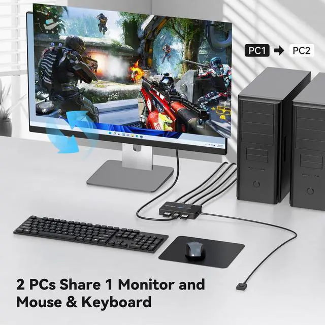 KVM Switch 1 Monitors 2 ComputersThis HDMI KVM switch allows control of 2 computers and one monitor with just one set of keyboard and mouse. There is no need to change monitors and input devices frequently, which greatly improves work efficiency. It not only keeps your workspace tidy, but also saves you money and reduces duplicate equipment purchases.