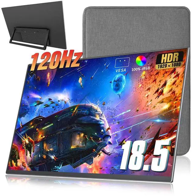 18.5 Inch HD Portable MonitorDelivers 1920*1080, 100%sRGB, Aspect ratio 16: 9, Provide widescreen viewing experience, owns 120hz high refresh rate with 178 wide viewing angle, breathtaking viewing quality & HDR technology, our portable laptop monitor has excellent color rendering ability, provide the clearer, smooth, excellent performance in gaming/multimedia. It can effectively reduce blue light radiation damage, no flickering, & make it easier to watch for a long time. ^^ 18.5 '' PORTABLE SCREEN MONITOR-WIDE COMPATIBLE extensive compatibility USB C portable external monitor provides 2 Full Feature Type-C ports and HDMI port, easy access to your favorite devices with 1 cable solution, compatible with most laptops, smartphones, PC, PS4, XBOX ONE, or compatible for ps, and more.