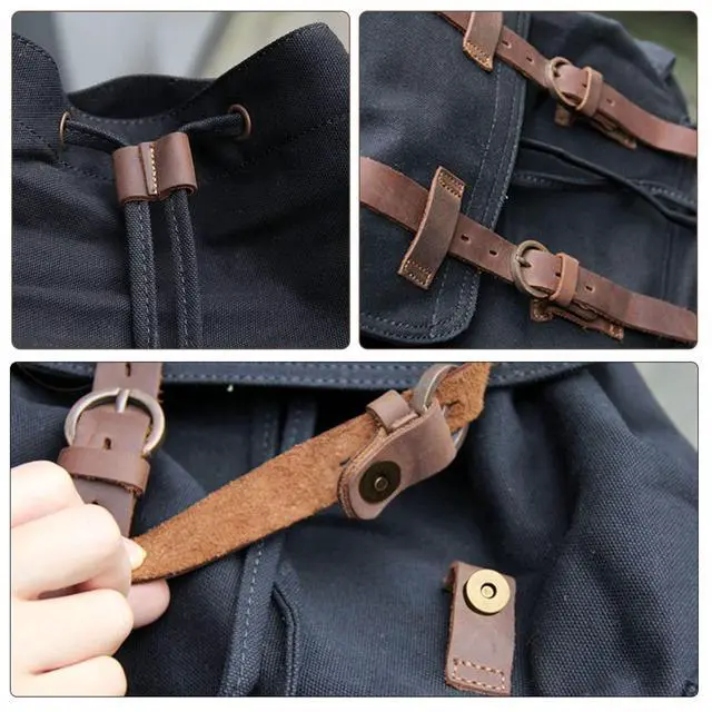 Canvas Backpack: Made of high quality enduring canvas fabric and cowhide, our backpack has a classic but stylish design with button closure, vintage brass hardware accents, adjustable shoulder strap, easy to put on and go.
