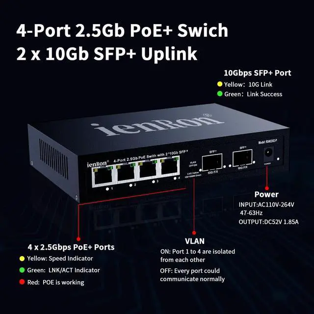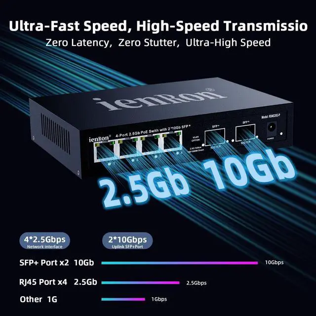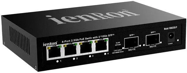 1. 2.5G PoE+ Switch Powered Ports for Ultra-Fast Data & Power Delivery Equipped with 4 high-speed 2.5G bps POE+ ports (IEEE 802.3 at), each delivering up to 30W of power, Total 96W perfect for powering high-demand devices like access points, PTZ security cameras, and PoE-powered VoIP phones without any performance loss. ^^ 2. Dual 10G SFP+ Uplink Ports for Lightning-Fast Backbone Connectivity Two 1.25 / 2.5 /5/10G auto-sensing SFP+ fiber ports enable seamless connection to core switches or servers, supporting future-proof network expansion with ultra-low latency and maximum throughput. ^^ 3.96W Total Power Budget with Advanced Safety Protection With a full 96W power supply and built-in overcurrent, overvoltage, short-circuit protection, this switch safely powers multiple high-power devices while safeguarding your network from electrical surges.