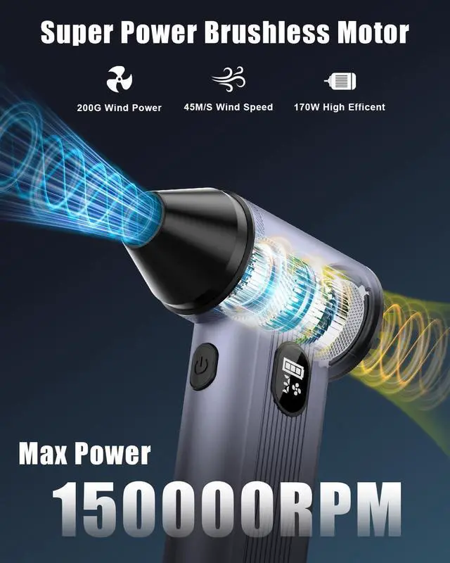EXCEPTIONAL POWER: FILIGO BC05 air duster is equipped with a high-performance 150, 000 RPM brushless motor, delivering a maximum wind speed of 45m/s and a wind force of up to 200G that easily blasts away stubborn dust, crumbs. 4 adjustable gear settings can easily adapt to various needs.