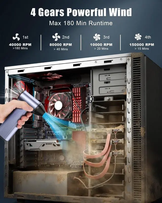 ^^ UPGRADED BATTERY LIFE: This air duster features an 8000mAh battery, a 33% increase in capacity (compared to 6000mAh model). It provides up to 180 minutes of runtime on the first gear, and up to 15 minutes in max gear, ensuring it can handle all your needs. ^^ FAST 3