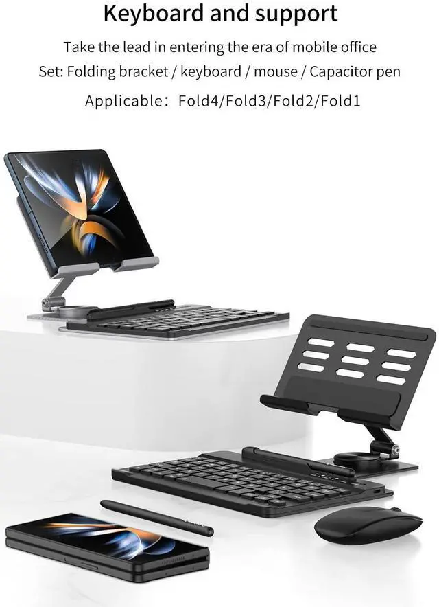 MATERIAL AEROSPACE ALUMINUM: The Galaxy Z Fold7 bracket is made of aerospace aluminum. This set includes[Bracket /Keyboard/Mouse/Capacitor Pen] 360Rotate POS Tablet Stand with a zip pull out, an integrated folding design, and a keyboard and support, allowing you to stay productive wherever you go. This stand set is Compatible with Galaxy Z Fold7//6/5/4/3 models and is an essential item for all your mobile office needs.
