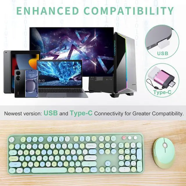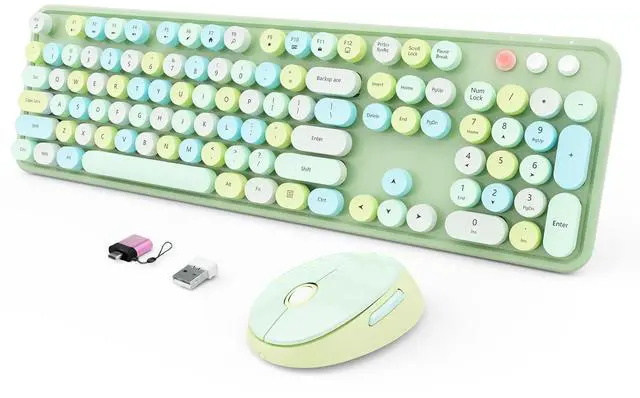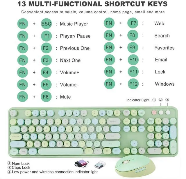 RETRO WIRELESS KEYBOARD AND MOUSE SETInfused with a blend of classic style and cutting-edge technology, this vintage typewriter-like keyboard is a chic product designed for those who set trends. Experience joy in a new day! ^^ COMFORT-DRIVEN KEYBOARD AND MOUSEUtilizing ergonomic principles, our vivid mouse features a snug pebble-shaped design that effectively minimizes wrist tension. ^^ VERSATILE HOTKEYSWith 15 hotkeys and a number pad, this wireless keyboard boosts efficiency and productivity in work and study settings. Its eye-catching design and impressive functionality are sure to impress.