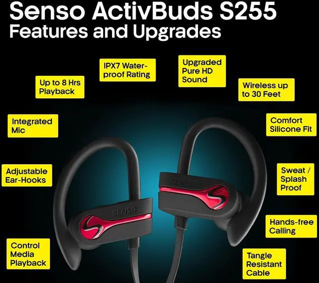 ^^ BLUETOOTH V 4.1 WIRELESS TECHNOLOGY WITH CVC 6.0 NOISE SUPPRESSION TECHNOLOGY - Connect seamlessly with all Bluetooth enabled devices up to 30 feet away. With Noise Suppression technology focus on your favorite music and answer calls without skips or missed words. ^^ 1 YEAR WARRANTY AND BONUS ITEMS - Bonus Accessories with 1-Year Manufacturer's Warranty and 30 days no-questions-asked return policy. Value for money guaranteed, Buy the Senso ActiveBuds worry free today.