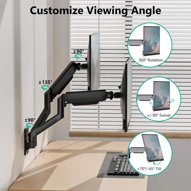 Sturdy Construction: The high-grade material gas spring arm can be extended 17" and retracted, +90/-45 tilt and +90/-90 swivel to change reading angles, and 360 rotate from landscape to portrait mode. ^^ Wall Mount Monitor Arm -