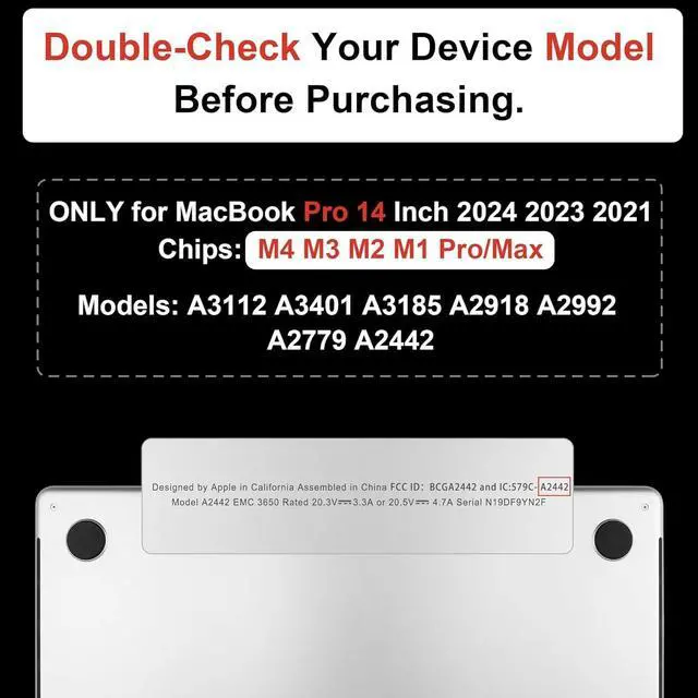 ReleaseModel: M5 A3434/ M4 A3112 A3185 A3401/ M3 A2918 A2992/ M2 A22779/ M1 A2442 Pro/ Max ChipPlease kindly check the model number "Axxxx" on the back of the laptop before your purchase. This case is not compatible with other unmentioned models. Product Information-- Good Quality Hard Plastic Case and Clear Bottom Cover, not sticker. -- Attractive and Distinctive Pattern Hard Case to Protect your MacBook from scrapes and scratches-- Precise construction allows complete access to all ports, features, Touch ID. -- Transparent design allows the logo see through the case.