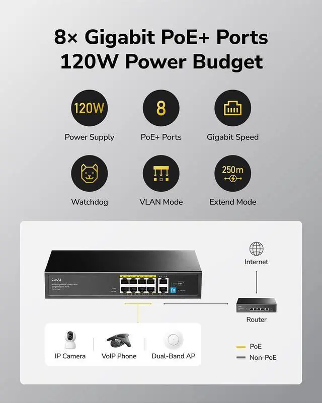 120 watts reliable 8 ports gigabit PoE+ switch. GS1010PE contains 10 gigabit RJ45 ports, #1~#8 port support PoE functions which could offer 120 watts total PoE budget, while port #9~#10 port are just uplink ethernet ports only transfer data. ^^ 8 Gigabit PoE+ ports Ideal for small installations of 8 PoE or PoE+ devices (IP Phone, Wired surveillance camera, Wireless Access Point). 2 Gigabit uplink ports are suitable for connecting to the Internet and NVR respectively, which is very suitable for video surveillance and WiFi access applications. ^^ Compatible with any IEEE 802.3 af PoE and IEEE 802.3 at PoE+ device.