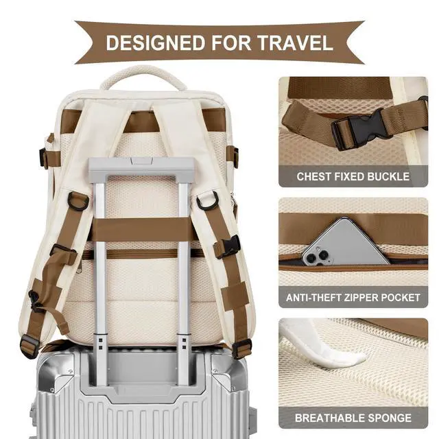 Great travel backpack for women This backpack is made of waterproof polyester, good air permeability and heat dissipation with two padded shoulder straps, offers lightweight carrying and strength reinforcement, relieve shoulder pressure, and maintain cool when wearing for a long time. And it's hard, solid, and doesn't fade. ^^ Separate Shoe Compartment Design & Wet Bag Main pocket x 2, laptop compartment x 2 (suitable for 13 "tablet and 14" laptop respectively), The wet bag is made of high density water resistant material can help you to separate dry items and wet items, if you have wet clothes or towel, you can put it in the wet bag.