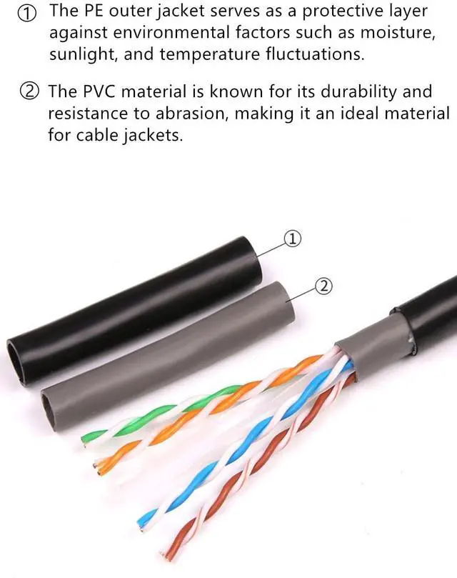 The Dual Jackets (PVC+LLDPE) Cat6 Bulk 200ft Ethernet Cable is a high-quality networking cable designed for both outdoor and indoor installations. With its double-layer protection, the cable can withstand direct sunlight, extreme cold, and high humidity, making it a reliable choice for any weather conditions. Featuring a UV-resistant LLDPE weather jacket and PVC inner jacket, the cable provides a strong and durable shield against harsh environmental factors. Additionally, its flexible core design ensures the cable won't bend or break, even in the harshest environments. Made with copper-clad aluminium wire, this Cat6 cable delivers high-speed connectivity with 4-pair unshielded twisted pair (UTP) cables.