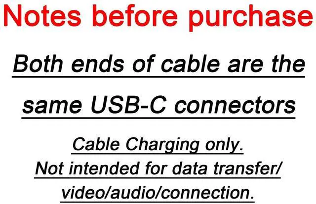 Not intended for data transfer/video/audio/connection): 1. This is USB-C to USB-C fast charging cable, has the same USB-C connectors on the both ends. 2. Actual charging speed depends on your device and wall charger. 3. This cable does not support video output. 4. Due to production, the margin of error is plus or minus 0.6 ft.